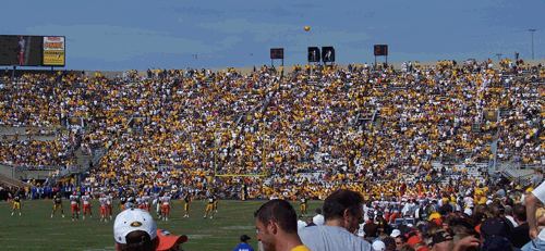 Ever wonder why taxi cabs are painted yellow? So you can notice one coming around the corner a mile away. Now take that strategy and apply it to a rabid fan base all decked out in yellow and black. Not the mild, toned down maize version of yellow, but the yellow color just short of fluorescent.