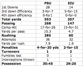 On Penn State’s first offensive drive of the game Daryll Clark capped off a ten play, 85 yard drive by extending the football over the goal line for a one yard touchdown similar to his pair of touchdowns the previous week. The score gave Penn State all the points they would need to win the game as Eastern Illinois failed to penetrate the end-zone all day. The visiting Panthers were only able to accumulate 207 yards with just 60 coming on the ground. Eastern Illinois also turned the ball over twice, with one resulting in a 91 yard fumble return for a touchdown by Penn State linebacker Navorro Bowman.