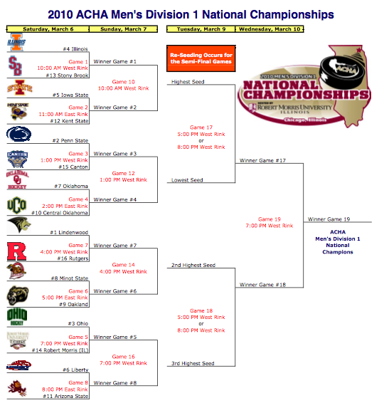 The #2 Icers begins their quest for their 8th ACHA national championship starting March 6th against the Kangaroos of #15 SUNY-Canton. The Kangaroos (17-8-2) secured their ACHA tournament spot by finishing first in the Eastern Collegiate Hockey League (ECHL). Should the Icers advance, they will play the winner of #7 Oklahoma/#10 Central Oklahoma on March 7th.