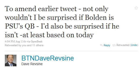 Bolden impressed not only reporters, but also the coaching staff, overcoming tremendous odds in the process to get to this point. Matt McGloin has been in the program for more than two years, Kevin Newsome was an early enrollee in the spring of 2008, and even Paul Jones, the forgotten man in all of this, graduated early to join the Penn State team in the spring.