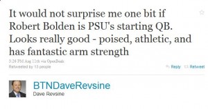 According to the Patriot-News, Bolden, along with sophomores Matt McGloin and Kevin Newsome, was informed of the decision at practice today. Bolden impressed onlookers throughout the summer, though the hype didn’t reach a critical mass until the Big Ten Network visited Penn State as part of their summer preview program. Dave Revsine gave most Penn State fans their first glimpse of Robert Bolden, and boy, was he impressed.